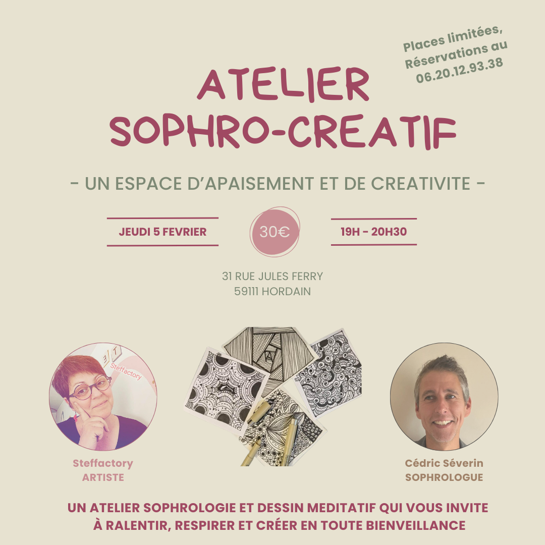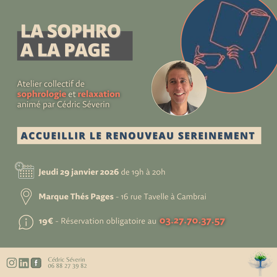 Actualité & ateliers Tout ce qu'il faut savoir sur les prochains ateliers et les actus à venir ! ATELIER COLLECTIF SOPHROLOGIEJeudi 29 janvier 2026 à 19h ACCUEILLIR LE RENOUVEAU SEREINEMENTRéservations au 03.27.70.37.57 Plus d'infos à venir ATELIER COLLECTIF SOPHRO-CREATIFJeudi 5 février 2026 à 19h DESSIN MEDITATIFRéservations au 06.20.12.93.38 Plus d'infos à venir ATELIER COLLECTIF SOPHROLOGIEJeudi 12 février 2026 à 19h OSER SA SINGULARITE POUR VIVRE + LIBRERéservations au 03.27.70.37.57 Plus d'infos à venir